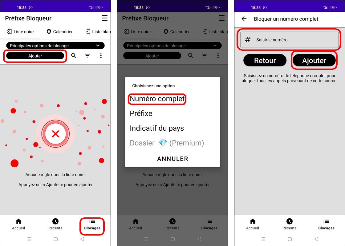 Ex : Touchez le champ Numéro complet puis saisissez le numéro à bloquer. Touchez le bouton Ajouter pour qu'il soit ajouter à la liste noire. |