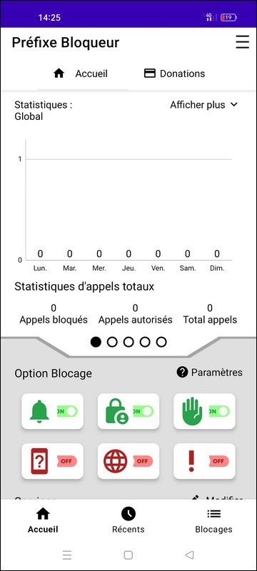 Vous arrivez alors sur l'écran d'accueil de Préfixe Bloqueur. Celui-ci affiche :