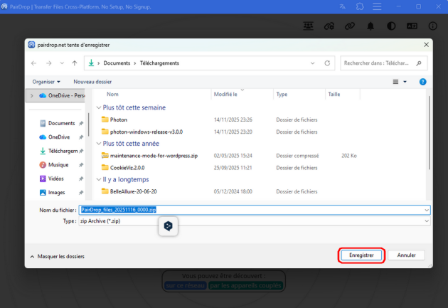 Lorsque le transfert est complet, une fenêtre s’ouvre sur votre PC vous proposant d’enregistrer le fichier dans le dossier Téléchargement. Vous n’avez plus qu’à cliquer sur Enregistrer. Le fichier est alors automatiquement téléchargé dans le dossier Téléchargement de votre PC et un message s'affiche sur votre smartphone et votre PC vous indiquant que le transfert est terminé.
